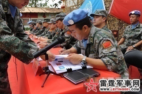 9月14日,驻扎在距利比里亚首都蒙罗维亚东部470多公里的绥德鲁阿尔伯特·怀特体育场的中国工兵营区阳光灿烂,联合国旗和中国的五星红旗在蓝天白云下迎风招展,中国500多名维和官兵,排成6个方队,整齐地站立在绿茵场上,庄严地接受联合国授予的“和平荣誉勋章”。