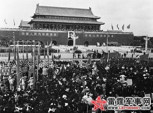 领导人讲完话,阅兵仪式正式开始。身着戎装的朱德总司令走下天安门,坐吉普车检阅了部队,那时部队都停留在天安门城楼东。“等朱老总返回城楼,部队开始行进在天安门前,坦克团、26架飞机、1600匹红色及白色战马,展示解放军的武装实力,霎时让人感受到一个国家政权的威严。”