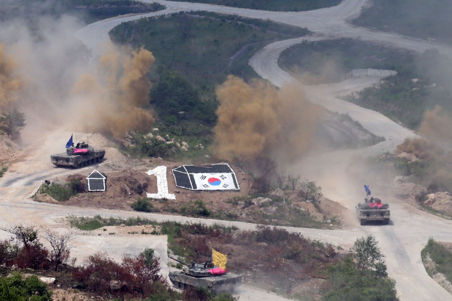 韩美举行联合军演 现场出现朝鲜国旗:当地时间6月22日,韩国京畿道抱川,纪念朝鲜战阵爆发62周年,韩美举行军事演习。这是自朝鲜战争结束以来,韩美举行的最大规模实弹演习。在两军演习现场,还罕见地出现了朝鲜国旗。